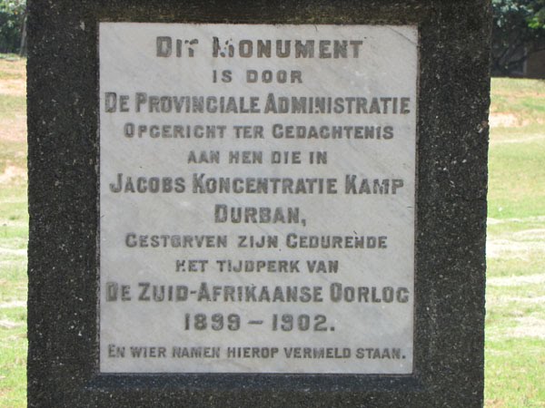 The first concentration camp to be erected in Durban was the Merebank concentration camp 12 kilometres South of the city, on the south coast railway line. This camp which was to become the largest concentration camp of the war with its more than 8,000 inhabitants were erected on wet marshy land that caused health and comfort problems. Criticism of the site had little effect.